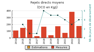 | Système de collecte : Les postes de relevage de plus de 120 kg/j de DBO5 sont équipés pour les mesures de déversement d'orage. Présence d'eaux claires parasites. |