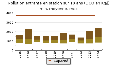 | Système de collecte : Arrivée d'eaux claires parasites. Les effluents représentent 40% de la charge nominale de la station. Des bypass sont enregistrés. |