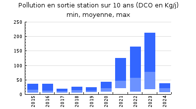| Station d'épuration : Evaluation step : à améliorer (en cours) Bon entretien de la station réalisé par SUEZ. Le fonctionnement de la station est perturbé par larrivée deaux industrielles et deaux claires parasites (accidents de lessivage fréquents). Ouvrage vieillissant et situé en zone inondable. Charges hydrauliques et organiques moyennes. Les bilans 24h réglementaires réalisés par SUEZ montrent une charge hydraulique correspondant en moyenne annuelle à 99.7% de la capacité nominale (variations de 18 à 178%), et une charge organique de 38.6% (variations de 5 à 99%). Les rendements épuratoires obtenus sont bons à très bons sur les paramètres carbonés et les MES, moyens à bons sur le NGL et faibles sur le Pt. Les rejets sont de bonne qualité et répondent à larrêté de la station en 2024, sauf sur le phosphore où la limite de 2mg/l est dépassée lors de 2 bilans (la station ne traite pas le Pt). La commune a lancé une étude de faisabilité pour le renouvellement de la station en 2024 et va rechercher un maître duvre en 2025. Le réseau sera également inclus dans les travaux, suite au diagnostic réseau qui préconisera les travaux à effectuer. |