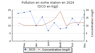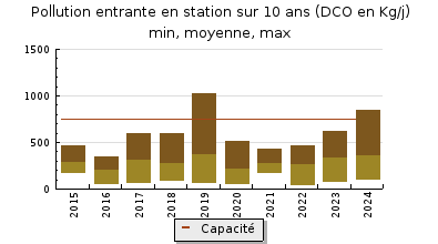 | Station d'épuration : Evaluation step : bon Bon entretien de la station par SUEZ. Bon état général des ouvrages et bon fonctionnement de la station. Le génie civil de louvrage de stockage des eaux traitées est toujours dégradé. Charge hydraulique très forte, charge organique moyenne : lors des 12 bilans mensuels réalisés par Suez en 2024, la charge hydraulique mensuelle moyenne de la station a varié de 56 à 242 %, avec une moyenne annuelle de 150% de la capacité nominale. La charge organique est en moyenne annuelle moyenne à faible avec 42% de la capacité nominale (variable selon la dilution de 15 à 173% en moyenne mensuelle). Les rendements moyens sur les paramètres DBO5, DCO, MES et NGL, Pt sont bons à très bons. Bonne qualité des rejets : les rejets traités en sortie de station sur l'année 2024 sont très bons pour lensemble des paramètres : l'autorisation de rejet de 2007 est respectée ainsi que les prescriptions de larrêté de 2015. |