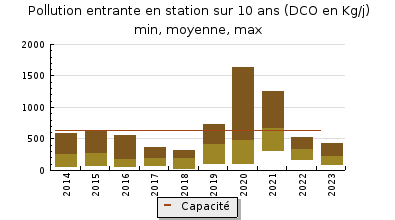 | Système de collecte : ? Déversements d'eaux usées observés sur le réseau (DO / trop plein de poste) Par temps sec : non Par temps de pluie : oui Si oui, liés à des problèmes d'exploitation (bouchage DO, pannes pompes .): ? Arrivées d'effluents non domestiques: Quelles origines? RAS en 2023 Avec dysfonctionnement de la station d'épuration: non observé en 2022, ni en 2023 Estimation des charges organiques non domestiques reçues kg DCO ou DBO5 / an: pas d'information ? Arrivées d'eaux parasites temporaires et/ou permanentes Estimation des ECPP: 76% sur l'AS 2023 ? Surcharges hydrauliques (sur plusieurs jours): oui (janvier, mars, avril, mai, juin, octobre, novembre, décembre) entraînant un dysfonctionnement de la station: oui, sous-dimensionnement des prétraitements Volume moyen mensuel maximum reçu: décembre 2023: 1463 m3/j ? Entretien du réseau d'assainissement Entretien correct des équipements électromécaniques (pompes)? oui Entretien régulier des postes (pompages des flottants et curage des postes)? oui Destination des produits de curage? Absence d'information Poste de relèvement principal sous télésurveillance? non Réseau unitaire : curage régulier des tronçons et des DO? Absence d'information Étude diagnostic réseau réalisée: terminée fin 2015 Le maître d'ouvrage fait il des recherches de mauvais branchements? non Le maître d'ouvrage fait-il ou prévoit-il de faire des travaux de réhabilitation du réseau? oui |