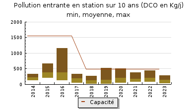 | Système de collecte : ? Déversements d'eaux usées observés sur le réseau (DO / trop plein de poste) Par temps sec : Non Par temps de pluie : Oui ? Arrivées d'effluents non domestiques: Oui Quelles origines? Laiterie, cliniques, foirail... Avec dysfonctionnement de la station d'épuration: Non ? Arrivées d'eaux parasites temporaires et/ou permanentes Estimation des ECPP: selon les mesures réalisées en mai/juin 2016 par C2EA dans le cadre du diagnostic réseau, 84% des effluents transitant par les réseaux d'assainissement par temps sec sont des ECPP. Si l'on tient compte des résultats d'autosurveillance de l'année 2023 en tenant compte des volumes déversés en entrée de station, le taux d'ECPP est de 91%. ? Surcharges hydrauliques (sur plusieurs jours): On observe des dépassements de la charge nominale au nombre de 26 en 2023. Toutefois, la surcharge hydraulique maximale admise a été de 1872 m3/j soit une surcharge hydraulique très faible représentant 5% du débit nominal. Le volume moyen annuel traité est de 1205 m3/j en 2023. Des déversements au milieu récepteur ont également été recensés sur 36 journées (volume moyen by passé 20 m3/j). On notera toutefois que sur les 36 jours de déversements, 10 jours de déversements ont des débits journaliers inférieurs (ou égaux) à 5m3/j et que 13 jours disposent de déversements supérieurs à 150 m3/j (avec un débit max journalier déversé de 1083m3/j). Enfin, on constate que le volume total annuel déversé est en baisse avec 7 365 m3/an en 2023 contre 21 160m3/an en 2022. entraînant un dysfonctionnement de la station: Non ? Entretien du réseau d'assainissement Entretien correct des équipements électromécaniques (pompes)? Absence d'équipements électromécaniques Entretien régulier des postes (pompages des flottants et curage des postes)? Absence de postes Destination des produits de curage? Sans objet Poste de relèvement principal sous télésurveillance? Sans objet Réseau unitaire : curage régulier des tronçons et des DO? Oui Étude diagnostic réseau réalisée: Oui diagnostic réalisé en 2017 Le maître d'ouvrage fait il des recherches de mauvais branchements? Oui Le maître d'ouvrage fait-il ou prévoit-il de faire des travaux de réhabilitation du réseau? Oui |