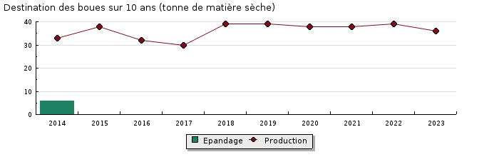 | Sous produits : La quantité de boues produites déclarée par lexploitant en 2023 est de 35,8 tonnes de matières sèches. Le ratio boues produites (hors réactifs) par rapport à la quantité de DBO5 éliminée (moyenne des bilans 24h) est satisfaisant (0.9). Les boues sont déshydratées et stockées sur des filtres à macrophytes. Aucun curage de boues na été effectué depuis la mise en service de la station. La SAUR envisage de réaliser le curage de 2 des 8 casiers en 2024. |