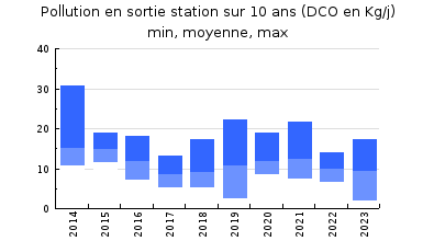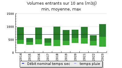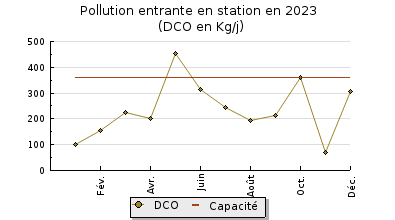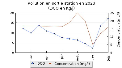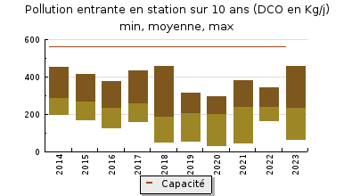 | Station d'épuration : Le fonctionnement général de la station et ses performances épuratoires sont satisfaisants. La charge hydraulique moyenne annuelle (entrée station) est de 86% en 2023 (min. mesuré : 28% - max. : 223%). 114 dépassements de la capacité hydraulique nominale ont été mesurés et 64 déversements ont été comptabilisés au niveau du point A2 en amont immédiat de la station. Les dépassements les plus conséquents et la majorité des déversements ont eu lieu entre la mi-octobre et la fin de lannée, période pendant laquelle de forts cumuls pluviométriques ont eu lieu provoquant des crues de la Charente et une saturation hydraulique des sols. 3263 m3 deaux brutes ont été déversés par le point de déversement A2, soit 1.48% du volume deaux brutes traité par la station. La charge organique moyenne annuelle (entrée station) est de 33% en 2023 (min. mesuré : 6% - max. : 79%). Lors des bilans dautosurveillance, les résultats analytiques et les rendements épuratoires étaient globalement satisfaisants. Le rejet respectait les normes de larrêté de prescriptions spécifique de la station. Le nombre de bilans réglementaires réalisé en 2023 est conforme aux exigences réglementaires. Les effluents traités sont pompés et rejetés dans la Charente. Les équipements dautosurveillance réglementaire fonctionnent convenablement. A noter que lors du bilan de juillet initialement prévu en début de mois, le préleveur dentrée sest colmaté. Le bilan na pas été validé et a été reporté le 19 juillet. Lentretien et exploitation de la station sont satisfaisants. Conseillé : - Nettoyer le bol de dosage et les bidons de prélèvement des préleveurs avant chaque bilan réglementaire. - Nettoyer régulièrement le pluviomètre de la station et le calibrer deux fois par an. - Installer un système de ventilation efficace dans le local de prétraitement (dégazage dH2S) pour assurer la sécurité des agents dexploitation et limiter la dégradation des équipements métalliques. - Faire chaque année un échantillonnage de boues des lits de séchage plantés de roseaux pour analyser la teneur en matières sèches et en cuivre. Lobjectif est danticiper un éventuel curage des boues si la teneur en cuivre devient trop proche de la concentration limite pour lépandage agricole. FAITS MARQUANT ET FICHES ALERTES : Réseau dassainissement : A partir du 15 octobre 2023 et jusquà la fin de lannée, les fortes précipitations ont provoqué des crues de La Charente et des inondations de réseau. Ces évènements ont contraint à larrêt de postes de relevages submergés, en novembre et mi-décembre : - PR de Fontaury : Pompage arrêté du 3/11 au 22/11 puis du 11/12 au 08/01/2024 - PR Chemin de La Fuie : Pompage arrêté du 09/11 au 21/11 puis du 13/12 au 19/12/2023 Station dépuration : - 07/02/2023 : coupure général EDF sur Châteauneuf de 13h à 19h30 provoquant un arrêt de la station et un débordement au point A2 (PR Place du Pont) de 163 m3. - 04/05/2023 : Panne surpresseur daération du BA. Renouvellement des joints détanchéité chez un prestataire et remise en place. - 02/08/2023 : coupure général EDF sur Châteauneuf de 20h à 22h provoquant un arrêt de la station et un débordement au point A2 (PR Place du Pont) de 18 m3. - Augmentation importante des débits deaux brutes à partir du 15 octobre 2023 et jusquà la fin de lannée suite à de fortes précipitations. |