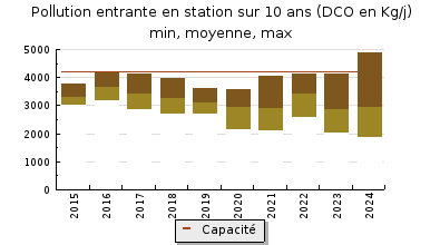| Station d'épuration : Charge et résultat des bilans : La station dépuration a reçu en moyenne 51% de sa charge organique soit 17 766 EH. Le flux entrant en DBO5 varie entre 412 kg/j et 2287 kg/j soit entre 20% et 109% de sa capacité. La capacité organique en prenant en compte la DBO5 a été dépassée à 2 reprises au cours de lannée. A noter que la charge moyenne reçue par la station en DCO est de 68%. La capacité de la station a été dépassée à 4 reprises sur le flux en DCO. Les résultats des bilans respectent les normes de rejet. A noter que le rendement en phosphore total est régulièrement non respecté mais la station est tout de même conforme sur ce paramètre car la conformité se fait sur la moyenne annuelle en concentration ou en rendement. Travaux achevés en 2024 : -remise en état de la déphosphatation (changement de la cuve et canalisation dinjection uniquement sur le grande file) ; -renouvellement de la filière matières de vidange ; -mise en place dune injection dacide à au niveau des filtrats de la file boue. Cette injection provoque une vapeur dacide dans le local à boue et au niveau du poste toutes eaux cela est néfaste pour les agents dexploitation. Autres constats : Le bassin danoxie est toujours utilisé comme bassin danaérobie. Afin de reprendre un fonctionnement comme bassin danoxie, la pompe de liqueur mixte est à remettre en service. Des remontés de boues sont régulièrement constatés au niveau du clarificateur de la grande file. De plus, le clifford et les cloisons siphoïdes sont dégradés (présence de trous). Le génie civil du bassin daération de la grande file est très fragilisé. Létat de vétusté de la filière boue et son manque de fiabilité a contraint lexploitant dutiliser une unité de centrifugation mobile pour pallier cette situation. LUMD est installée sur le site en permanence. Lexploitation de la station est compliquée au vu de la vétusté de lensemble des ouvrages (file eau et file boue) et de la gestion difficile des extraction de boue. Réglementation : Le manuel dautosurveillance est à actualiser, à transmettre à la DDT, lAgence de lEau et Charente Eaux pour validation et mise en application conformément à larrêté ministériel du 21 juillet 2015. Vérification des appareils de mesures : Déversoir en tête de station A2 Deux sondes radar Véga ont été installées afin de mesurer le niveau deau en amont et en aval du déversoir. Le bureau détude 3D EAU a réalisé une modélisation afin de définir une courbe débitmétrique. La vérification de la mesure de la hauteur deau au niveau des deux sondes le 28 mai a permis de montrer un écart entre la valeur de la sonde Véga amont et la supervision de 30 mm. La valeur de la sonde correspondait à la hauteur simulée. Un recalage du 4/20 mA a permis de corriger lécart. A la suite de la correction, les simulations réalisées ont permis de montrer un fonctionnement satisfaisant du système de comptage des eaux déversées. La transmission de la mesure de la sonde amont vers lautomate est satisfaite depuis le remplacement dune carte de lautomate en début dannée. Fonctionnement du préleveur La répétabilité des volumes des échantillons, la température dans lenceinte du préleveur, la transmission des impulsions et la vitesse daspiration sont satisfaisantes. Entrée station A3 : Fonctionnement du débitmètre La vérification du débitmètre entrée ne peut pas être réalisée par la mise en place dun débitmètre portable en parallèle. Les longueurs droites préconisées en amont (5 fois au moins le diamètre) et en aval (3 fois le diamètre) ne sont pas respectées et ne permettent pas une mesure en parallèle. Lécart entre le volume mesuré en entrée et celui mesuré en sortie respecte la tolérance de +/-10%. Cet écart ne montre pas de dérive de la mesure du débitmètre électromagnétique. Elle est donc satisfaisante. La valeur du débitmètre et celle de la supervision concordent. Fonctionnement du préleveur Le fonctionnement du préleveur est satisfaisant mais |
