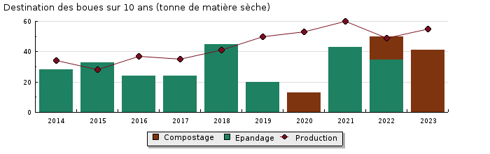 | Sous produits : La filière boues a été modifiée afin de réaliser des évacuations de boues en compostage tous les 15 jours. 41t MS ont été évacuées en centre de compostage en 2023, ce qui constitue un écart avec la boue produite (54t). Il est possible que le prélèvement de boue fait dans la benne ne soit pas assez représentatif à chaque évacuation. La production de déchets de dégrillage est stable depuis 3 ans. |