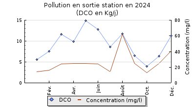 | DBO5 | 44 Kg/j | 24 % | 124 mg/l | 98 % | 0,9 Kg/j | 2,3 mg/l |