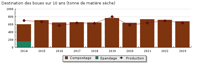 | Sous produits : 20.4 SOUS-PRODUITS ISSUS DE LASSAINISSEMENT Les refus de dégrillage collectés au cours de lannée représentent 31 tonnes. Les sables produits au cours de lannée représentent 27 tonnes (données Véolia). Les sous-produits issus du réseau de collecte (matière de curage) ont été estimés à 39,5 tonnes, ces derniers ont été envoyés à la station pour traitement. 20.5 BOUES Production de boues théorique (kg de MS) : Entre 443 500 à 467 872 Production de boues réelle (kg de MS) : 640 458 -163 213 = 477 245 kg de MS Ecart (%) : +2% à +8% La production de boues théorique annuelle est calculée à partir des bilans pollution réalisés en 2023. La production de boues réelle est calculée en soustrayant la quantité de matières sèches générées par les matières de vidanges (7 633 m3 de matières de vidange ont été injectés sur lannée soit 163 213 kg de MS) de la production de la file boue. La quantité de matières sèches des matières de vidange est estimée via la charge en DCO (15 kgMS /Eh DCO). 11,7 tonnes de polymères ont été utilisés pour le conditionnement des boues avant déshydratation. 675 tonnes de boues ont été évacuées vers un centre de traitement agréé. |