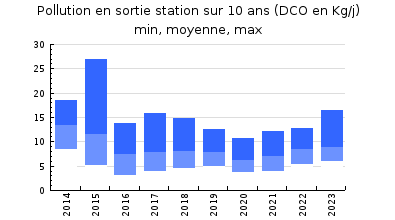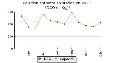 | DBO5 | 86 Kg/j | 35 % | 345 mg/l | 99 % | 1,2 Kg/j | 4,1 mg/l |