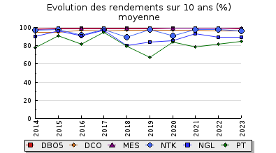 | PT | 2,4 Kg/j | 9,2 mg/l | 85 % | 0,4 Kg/j | 1,4 mg/l | |