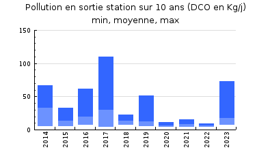 | DBO5 | 64 Kg/j | 36 % | 294 mg/l | 98 % | 1,4 Kg/j | 5,4 mg/l |