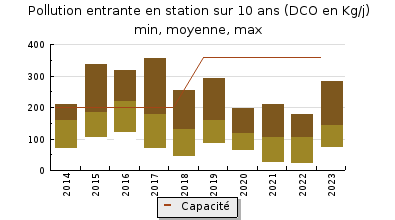 | Système de collecte : Il a déjà été identifié par le passé que le réseau présente une certaine sensibilité vis-à-vis de la collecte deau claire parasite. En 2023, avec les précipitations importantes qui se sont produites aux mois de novembre et décembre, un volume deau claire conséquent a été collecté, occasionnant un passage au trop plein du bassin tampon 5 jours consécutifs (au mois de décembre). Le tableau présenté ci-dessous met en évidence linfluence de la nappe et des précipitations sur quelques périodes ciblés : Date Volume journalier Hauteur de précipitations Taux de charge hydraulique Nappe haute temps de pluie 12/03/2023 442 m3 24 mm 89 % Nappe haute temps sec 22/02/2023 132 m3 0 mm 27 % Nappe basse temps de pluie 13/11/2023 537 m3 8 mm 108 % Nappe basse temps sec 21/11/2023 240 m3 0 mm 48 % En 2023, la capacité hydraulique nominale de la station a été dépassée 14 fois. Le volume maximum a été collecté le 12 décembre avec 856 m3 mesuré sur le point A3 et 216 m3 mesuré sur le point A2 (by-pass). Cela représente un volume total de 1 072 m3, soit 216% de la capacité hydraulique nominale de la station. En moyenne journalière, le réseau a véhiculé 237 m3/j, soit 48 % de la capacité hydraulique nominale de la station en 2023. Le percentile 95 (PC95) des débits entrants est de 353 m3/j en 2023. La Charge Brute de Pollution Organique (CBPO) collectée représente 2 803 EH pour une station dépuration de 3000 EH de capacité. Les postes de relevages sont entretenus par le personnel du SIVOM (nettoyage remplacement des petits équipements) et les horocompteurs des pompes sont suivis de façon hebdomadaire. En cas de bouchage sur le réseau, lentreprise CADIOT est sollicitée pour réaliser des hydrocurages. Des débouchages sont aussi réalisés en régie avec la pompe à vide du SIVOM. 645 abonnés sont raccordés au réseau de collecte pour le secteur Domme-Cenac (Donnée de 2021, pour 2022, le détail nest pas connu pour le secteur Domme Cenac, il y a 777 abonnés au total sur Domme, Cenac et St Julien). |