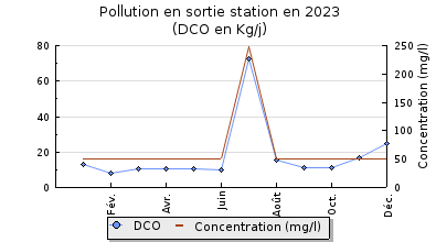 | DBO5 | 64 Kg/j | 36 % | 294 mg/l | 98 % | 1,4 Kg/j | 5,4 mg/l |