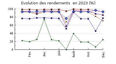 | Station d'épuration : Le fonctionnement de la station donne satisfaction avec une eau traitée de très bonne qualité tout au long de lannée. Les douze mesures dautosurveillances réglementaires ont été réalisées. La mesure de janvier a été refaite au mois daoût car les données volumétriques nont pas pu être récupérées au mois de janvier. 4 mesures bactériologique ont été réalisées sur leau traitée pendant la période estivale, lorsque les lampes UV sont en fonctionnement (trois mesures imposées). Le résultat de ces mesures indique un bon à très bon abattement des Escherichia Coli et des coliformes. Le contrôle du dispositif dautosurveillance a été réalisé par lATD 24. Les points de mesures A3, A4 et A6 donnent satisfaction, débitmètre et préleveur confondu. Au niveau du déversoir dorage (point A2), les conditions de vérification ne permettent pas de garantir une fiabilité de lappareil sur des hauteur deau élevé mais une bonne lecture jusquà une hauteur de 135 mm, ce qui correspond à un débit de lordre de 40 m3.h-1, ou encore le débit de la pompe qui alimente le bassin tampon, soit le débit maximum admissible. Un colmatage des diffuseurs dair du bassin daération sest produit en 2023, au point de ne plus avoir de bullage fin mais quelques zones de « grosses bulles » visibles à la surface du bassin daération. Dans un premier temps, une injection dacide formique a été réalisée. Cela a permis daméliorer un peu la qualité du bullage, sans pour autant de retrouver une situation dite normale. Les diffuseurs ont été intégralement remplacés au mois de juin. Il a été constaté au niveau des diffuseurs usagés que ces derniers étaient recouverts dune pellicule visqueuse. Un prélèvement déchantillons de cette pellicule a été effectué pour analyse. Il sest avéré que cette couche visqueuse est constituée en grande partie de matière plastique. Cela a conduit à une réflexion sur le dosage du polymère utilisé pour la déshydratation des boues. Le taux de consigne pour le dosage du polymère a été diminué au niveau de lautomate (courant juillet). Quelques semaines plus tard, il sest avéré que lautomate ne diminuait pas le taux de consigne car la pompe dinjection fonctionnait à son rendement minimum. Lintervention de la société ADIPAP (fournisseur du polymère) et de OPURE (pour la partie électromécanique) ont été utile pour réaliser des modifications. A partir du mois de décembre, la quantité de polymère injectée a pu être diminuée de lordre de 33% par rapport à ce qui était injecté précédemment. |