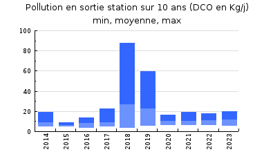 Station d'épuration : Les analyses des prélèvements réalisés dans le cadre des bilans dautosurveillance réglementaires font état dune bonne qualité de traitement. La station a reçu en moyenne 264 m3/j en 2023, soit 68 % de la capacité hydraulique nominale de la station. Le débit nominal de la station est dépassé 58 fois. Le volume maximal enregistré a été reçu le 11 mars 2023 avec 924 m3/j deffluent entrant (et une précipitation associée de 30 mm), soit 239 % de la capacité hydraulique nominale de la station. Le taux de charge organique moyen journalier est de 162 kg de DCO par jour, soit 44 % de la capacité nominale de la station. La Charge Brute de Pollution Organique (CBPO) calculée sur la DBO5 pour lannée 2023 est de 1 900 EH pour une capacité nominale de 2 500 EH. Il manque 13 jours de données débitmétrique en 2023 suite à un problème dautomate sur le site dexploitation. Le suivi des équipements par lexploitant est exemplaire. |