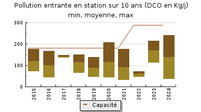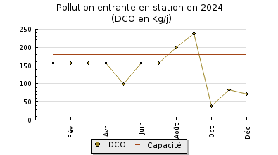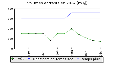 | Système de collecte : La nouvelle station dépuration a été mise en service le 01/08/2024. Elle est équipée dun débitmètre électromagnétique placé en amont des prétraitements. Sur 148 valeurs enregistrées, le volume moyen est de 119m³ par jour soit 33% de taux de charge. La station a reçu 242m³ au maximum soit 37% de sa capacité hydraulique nominale. La Charge Brute de Pollution Organique (CBPO) a été mesurée durant lété et est intimement liée à laffluence touristique. Elle correspond à 1649 EH (sur la base de la DBO5) soit moins de 70% de la capacité organique nominale de cette nouvelle installation. Le trop plein du poste de relevage dentrée est équipé dune mesure de débit (A2). 49 mesures ont été enregistrées en 2024. Sur ces mesures il y a eu un seul débordement de 670 litres déversés dans la Vézère le 20/12/2024. |