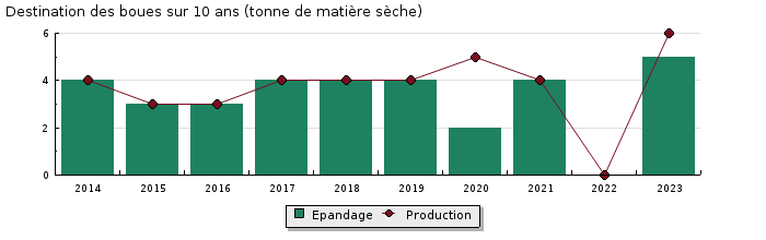 | Sous produits : 16.3 SOUS-PRODUITS ISSUS DE LASSAINISSEMENT Les refus de dégrillage ne sont pas quantifiés et évacués avec les ordures ménagères. Les graisses et les sables accumulé sont pompés par camion hydrocureur par lentreprise CADIOT. 16.4 BOUES Les boues sont extraites du clarificateur et épaissies dans le silo. Elles sont ensuite épandues sur les parcelles agricoles référencées au plan dépandage suivies par la Chambre dAgriculture. La production de boues théorique annuelle est calculée à partir des 16 derniers bilans pollution réalisés entre 2020 et 2023 et en prenant en compte au mieux possible, la pondération de variation de charge entre la saison estivale et la basse saison. Lautonomie de stockage du silo est estimée à environ 6 mois (avec une hypothèse sur la siccité des boues au sein de louvrage de 20 g/L et dun volume de stockage de 140 m3). Production de boues théorique (kg de MS) : 5 800 à 6 200 Production de boues réelle (kg de MS) : 5 621 Ecart (%) : - 9 à - 3 % |
