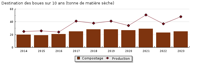 | Sous produits : 19.3 SOUS-PRODUITS ISSUS DE LASSAINISSEMENT Les refus de dégrillage sont quantifiés et évacués avec les ordures ménagères. 19.4 BOUES Les boues sont extraites du clarificateur, épaissies dans un silo, déshydratées par filtre presse-bande et stockées en benne avant dêtre évacuées vers la plateforme de compostage du SICTOM du Périgord Noir située à Marcillac St Quentin. Au mois de septembre, une évacuation de boues du silo a été transféré vers la station du Lardin (0524229V003) pour soulager le taux de boues du bassin daération, la presse de la station étant insuffisante pour extraire suffisamment de boues. La presse à boues est vieillissante et est sujette à des dysfonctionnements récurrents. Les boues sont souvent stockées dans la file eau de la station. Une étude de réhabilitation de la filière boues va être réalisée, plus globalement dans le cadre de la réhabilitation de la station (la collectivité a mandaté le bureau détudes SOCAMA pour mener ce projet). Il est de nouveau constaté une incohérence entre la quantité de matières sèches produite et la quantité de matières sèches évacuée. En effet, la quantité de matières sèches évacuée est inférieure à la quantité de matières sèches produite. Il semble que les concentrations utilisées pour le calcul de la production de boues produites soient surestimées. Année Volume traité (m3/an) Boues produites A6 (t MS) Boues évacuées (t MS) 2015 171 465 25,6 19,1 2016 180 426 23,9 21,3 2017 172 833 41,3 24,6 2018 197 733 37,6 27,7 2019 178 798 41,0 28,5 2020 193 567 34,3 27,4 2021 200 560 51,1 28,8 2022 185 520 36, 7 22,0 2023 208 057 47,9 24,7 La production de boues théorique annuelle est calculée à partir des bilans pollution réalisés en 2023 (en excluant la mesure du mois de décembre qui est peu représentative) et de plusieurs modèles mathématiques : Production de boues théorique (Tonne de MS) : 40 à 44 Production de boues réelle (Tonne de MS) : 47,9 Ecart avec les boues produites : + 8 à 19 % Production de boues théorique (Tonne de MS) : 40 à 44 Boues évacuées (Tonne de MS) : 24,7 Ecart avec les boues évacuées : - 44 à - 38 % |