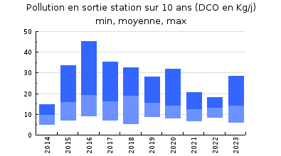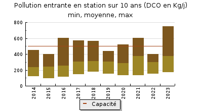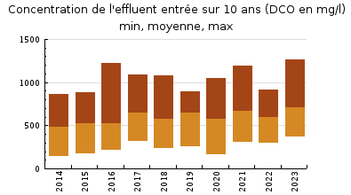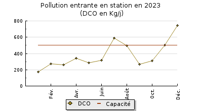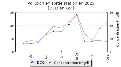 | Système de collecte : En 2023, le volume moyen collecté par le réseau (A2 et A1 compris) est de 718 m3/j, soit 96 % de la capacité hydraulique de la station. En prenant en compte uniquement les effluents traités par la station (point A3), le volume moyen est de 570 m3.j-1, ce qui représente 76 % de la capacité hydraulique nominale de la station. Le débit nominal de la station a été dépassé 63 fois (17% du temps). Le volume maximal comptabilisé en entrée de station est de 2 016 m3.j-1 (270 % de la capacité hydraulique de la station) atteint le 16 décembre 2023. A ce volume, il faut ajouter 1 208 m3 déversés par les trop-pleins des points A2 et 3 349 m3 déversés au niveau du point A1, soit un total de 6 573 m3.j-1 collectés par le réseau ou encore 876% de la capacité hydraulique nominale de la station. 43 jours de déversements ont été comptabilisés via les déversoirs dorage en tête de station (point A2, PR Tennis et PR step). 37 jours de déversement ont été comptabilisé au niveau du point A1 (DO CSC) Le volume total comptabilisé sur le point A2 est de 14 505 m3, soit 7 % du volume accepté par la station en 2023. Le volume total comptabilisé sur le point A1 est de 39 636 m3, soit 19 % du volume total traité par la station. Comme chaque année, il est possible que de leau en provenance de la Vézère vienne fausser les calculs des débit by-passés sur les points de mesure A1 et A2 pendant la période hivernale. Plusieurs déversements deaux brutes se sont produits pendant lété par les déversoirs du point A2. Le 9, 22, 25, 29, 30 juin, le 1, 2, 3 juillet et le 14 et 15 août pour un total de 1 749 m3. La Charge Brute de Pollution Organique (CBPO) est de 3 662 équivalents habitants en 2023 pour une station dune capacité de 4167 équivalents habitants. Le percentil 95 des débits entrants est de 945 m3.j-1 en 2023, soit 125% de la capacité hydraulique nominale de la station. Véolia a procédé à 19 contrôles de branchement en 2023 et a identifié 2 non-conformités. Les travaux suivants ont été effectué sur le réseau en 2023 : - Chemisage sur 200 ml d'un réseau diamètre150 en amiante ciment rue du Barry et mise en conformité des branchements de la rue du Barry - Extension de réseau au lieu-dit Lacoste avec 40 mL de canalisation diamètre 160 en PVC (future déviation de Lacoste). Une nouvelle étude diagnostique du réseau est en cours. La commune a missionné le bureau détude SOCAMA pour réaliser lassistance à maîtrise douvrage. Létude est menée par SUEZ CONSULTING et HYDRACOS. La phase 1 (reconnaissance) est terminée. La campagne de mesure en nappe basse a été réalisé dans le courant de lété 2023. La campagne de mesure en nappe haute devrait sachever dans le début de lannée 2024. |