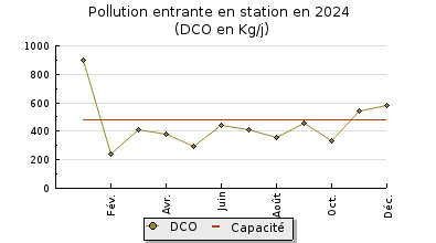 | Système de collecte : Lhistogramme des volumes mensuels (chapitre 7) permet de constater que le réseau est sensible aux intrusions eaux claires parasites. En outre, lanalyse des données du débitmètre entrée station fait apparaitre que la capacité nominale de la station a été dépassée à 165 reprises pour un volume journalier maximum de 2 971 m3/j mesuré le 30 mars 2024. Le débit de référence a été dépassé 62 fois. (Pour rappel Qref = 1 839 m3/j). Le débit moyen collecté est de 1 118 m3/j soit 106% de la capacité hydraulique nominale. Le percentile 95 (PC95) des débits entrants est de 2 380 m3/j. La Charge Brute de Pollution Organique (CBPO) collecté représente 3 376,20 EH pour une station dépuration de 7000 EH de capacité. |