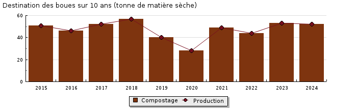 | Sous produits : Les refus de dégrillage sont quantifiés et évacués avec les ordures ménagères. Production de boues théorique (kg de MS) : De 38 000 à 42 300 Production de boues réelle (kg de MS) : 62 020 Ecart (%) : De -63 à -47 La production de boues théorique annuelle est calculée à partir des bilans pollution réalisés en 2024. La différence entre le théorique et le réel peut sexpliquer en partie par une sous-estimation de la charge polluante entrante lors du bilan de septembre (en lien avec la collecte deaux claires parasites). Pour rappel, il a été convenu avec les services en charge du suivi que la quantité de boues produites serait assimilée à la quantité de boues évacuées, tant que la file boues ne serait pas modifiée de façon pérenne. Cette année encore les données des boues évacuées ont été inscrites comme boues produites sur le point A6 malgré la présence dune filière boues fonctionnelle. Les différents acteurs ont été questionnés à ce sujet et des modifications pourraient être apportées en 2025. Afin de mettre en avant le fait que lexploitant a tout de même mesuré les boues produites et les a déclarées en point S4, les données inscrites dans le paragraphe « boues extraites de la file eau » sont les boues réellement extraites. |