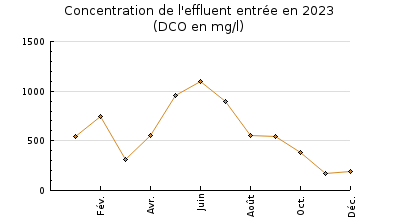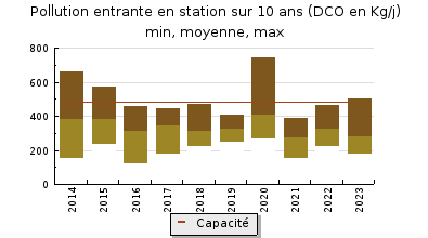 | Système de collecte : Les variations de volumes traités à la station concordent avec les périodes de nappe haute (cf. chapitre 7) ce qui signifie que le réseau est sensible aux intrusions deaux claires parasites. Les épisodes pluvieux ont aussi un impact sur la collecte deffluent mais dans une moindre mesure. Les mois de novembre et décembre sont une période de pluviométrie exceptionnelle et dinondation de la station, ce qui nest pas représentatif dun fonctionnement normal du système de traitement des eaux usées. Le volume maximum traité a été atteint le 15 décembre 2023 avec 1 597 m3/j comptabilisés en entrée (point A3) soit 266% de la capacité hydraulique nominale de la station. Le débit nominal de la station a été dépassé 93 jours, soit 25% du temps. 78 jours de déversement au niveau du déversoir dorage (A2) ont été comptabilisés, avec un volume journalier maximum déversé de 2 003 m3/j le 11 décembre 2023 (pluie journalière de 23,4 mm). En moyenne, le réseau a transféré vers la station 574 m3/j par jour (hors A2) soit 96% de la capacité nominal de la station. En prenant en compte le point A2, la station a reçu 644 m3/j soit 107% de la capacité de la station. Le percentile 95 (PC95) des débits entrants est de 932 m3/j (155% de la charge hydraulique nominale). La Charge Brute de Pollution Organique (CBPO) collecté représente 3008 EH pour une station dépuration de 4 000 EH de capacité. Lensemble des ouvrages constituant le réseau de collecte ont correctement fonctionnés tout au long de lannée. Larmoire du poste du Docteur Léger a été remplacée et la pompe est désormais géré par un automate. Les canalisations des pompes et de la vidange de la chambre à vannes du poste du Camping Rive droite ont été remplacées. Le poste de la Gare créé en 2022 bien que fonctionnel, voit son débit réduit. Des investigations complémentaires seront menées pour localiser la source de cette réduction. |