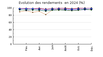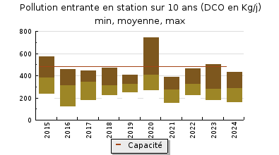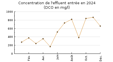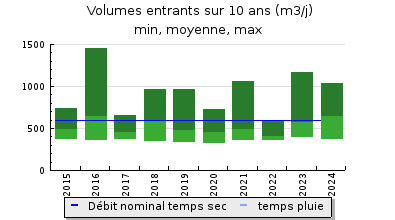 | Système de collecte : Les variations de volumes traités à la station concordent avec les périodes de nappe haute (cf. chapitre 7) ce qui signifie que le réseau est sensible aux intrusions deaux claires parasites. Les épisodes pluvieux ont aussi un impact sur la collecte deffluent mais dans une moindre mesure. Les mois de novembre et décembre sont une période de pluviométrie exceptionnelle et dinondation de la station, ce qui nest pas représentatif dun fonctionnement normal du système de traitement des eaux usées. Le volume maximum traité a été atteint le 30 mars 2024 avec 1 508 m3/j comptabilisés en entrée (point A3) soit 251% de la capacité hydraulique nominale de la station. Le débit nominal de la station a été dépassé 172 jours, soit 47% du temps. 115 jours de déversement au niveau du déversoir dorage (A2) ont été comptabilisés, avec un volume journalier maximum déversé de 1 802 m3/j le 27 février 2024 (pluie journalière de 11,6 mm la veille). En moyenne, le réseau a transféré vers la station 651 m3/j par jour (hors A2) soit 109% de la capacité nominal de la station. En prenant en compte le point A2, la station a reçu 706 m3/j soit 118% de la capacité de la station. Le percentile 95 (PC95) des débits entrants est de 974 m3/j (162% de la charge hydraulique nominale). La Charge Brute de Pollution Organique (CBPO) collecté représente 3016 EH pour une station dépuration de 4 000 EH de capacité. Lensemble des ouvrages constituant le réseau de collecte a correctement fonctionné tout au long de lannée. |