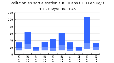 | Station d'épuration : Les prélèvements et analyses réalisés dans le cadre de lautosurveillance réglementaire présentent généralement un rejet dexcellente qualité, avec de très faibles concentrations sur tous les paramètres mesurés sur leffluent traité. Un dépassement des exigences en Pt est présente en mai, cependant lexigence sapplique sur la moyenne annuelle, ce qui permet de respecter la réglementation. La charge organique moyenne reçue par la station représente environ 1 900 EH soit 48% de la capacité de la station. La station a fonctionné correctement tout au long de lannée malgré la présence de graisses en surface du bassin daération et du clarificateur. Ces flottants ne sont pas liés à un dysfonctionnement mais à labsence douvrage dédié au traitement de ces graisses. Le remplacement de lautomate de la station a débuté fin 2024 et devrait se terminer début 2025., permettant ainsi de piloter la station à laide de sondes. Certains diffuseurs du bassin daération ont été remplacés suite au passage des scaphandriers en 2023. La diffusion de lair est désormais plus homogène. Un diagnostic de lensemble du système de traitement des eaux usées a été lancé en 2023 et se poursuivra en 2025. Des défauts structurels ont été identifiés et un plan daction devrait être présenté en 2025. Des actions ont dores et déjà été menées pour palier à ces défauts (bouchage des défauts du local des surpresseurs, ). |