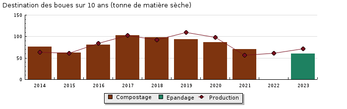 | Sous produits : Environ 9 tonnes de sable ont été produits durant lannée. Les refus de dégrillage sont stockés sur le site épuratoire, aucune évacuation de la benne en 2023. Production de boues théorique (tonnes de MS) : 48,8 à 58,3 Production de boues réelle (tonnes de MS) : 71 La production de boues théorique annuelle est calculée à partir des bilans pollution réalisés en 2023. La production de boues théoriques est à considérer avec précaution étant donné la grosse variabilité des charges entrantes. Lestimation de la production de boues réelle (A6) peut être entachée derreur, vis-à-vis des performances de la déshydrations ou bien de lévaluation de la concentration des boues extraites. La quantité de boues évacuées se rapprochent plus de lestimation théorique. Les boues extraites sont déshydratées sur site. Ces boues sont alors envoyées sur la plateforme de compostage de PAPREC à St Paul la Roche. La quantité de boues évacuées est de 59,4 tonnes en 2023. |