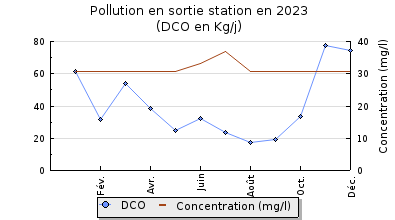 | Station d'épuration : Les analyses des prélèvements réalisés dans le cadre des bilans dautosurveillance réglementaires font état dune bonne qualité de traitement. Lors du bilan du 25 mai 2023, un dépassement sur le paramètre phosphore total a été observé (2,5 mg/L). Le traitement au chlorure ferrique a été réadapté par la suite. La station a reçu en moyenne 1 314 m3/j en 2023, soit 88 % de la capacité hydraulique nominale de la station. Le taux de charge organique moyen journalier est de 325 kg de DCO par jour, soit 28 % de la capacité nominale de la station. La CBPO (Charge Brute de Pollution Organique calculée sur la DBO5) pour lannée 2023 est de 2 676 EH pour une capacité nominale de 8 117 EH. En 2023, 6 mesures bactériologiques ont été réalisées. Une mesure apparait non conforme en bactériologie le 09/06/2023, du fait dun prélèvement non représentatif dun fonctionnement stabilisé de linstallation (arrêt de traitement UV lorsque le débit de rejet est nul). Point de mesure entrée "Abattoir" (A3, S1) : Ce point na pas été contrôlé du fait de la fermeture définitive de labattoir (dernier bilan en janvier 2021) Entrée (A3) : Le débitmètre ainsi que le préleveur fonctionnent correctement. Sortie (A4) : Le débitmètre ainsi que le préleveur fonctionnent correctement. Boues (A6) : Le débitmètre fonctionne correctement. Echantillonnage: Lexploitant réalise correctement le partage, lhomogénéisation et le prélèvement des échantillons Données SANDRE : Les données journalières du bilan transmises au format SANDRE ne sont pas similaires aux données relevées sur place. En effet, les données transmises sont les données dautosurveillance relevées de minuit à minuit alors que le bilan 24h est lancé en journée. Il est nécessaire soit décraser la donnée dautosurveillance lors des bilans par les relevés réalisés sur site, soit de lancer le prélèvement en différé de minuit à minuit en même temps que la relève des données débitmétriques. La cotation globale du dispositif dautosurveillance est de 10 sur 10. |