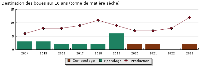 | Sous produits : 14.3 BOUES ET SOUS-PRODUITS ISSUS DE LASSAINISSEMENT Les refus de dégrillage sont quantifiés et évacués avec les ordures ménagères (780 kg). Production de boues théorique (kg de MS) : 8 000 à 8 500 Production de boues réelle (kg de MS) : 12 120 Ecart (%) : De +30 % à +33% La production de boues théorique annuelle est calculée à partir des moyennes des bilans de pollution réalisés en 2023, 2022, 2021, 2020 et 2019. Estimation des boues produites à partir des volumes boues journaliers par le débitmètre électromagnétique en 2023 et dune estimation de la concentration de boues en sortie de clarificateur de 5 g/L. Les extractions étant automatiques et régulières, les boues sont peu concentrées. Les eaux interstitielles sont évacuées régulièrement par le personnel exploitant permettant daugmenter lautonomie de stockage. Lentreprise Cadiot est intervenue afin de déshydratées les boues du silo. 2,39 tonnes de matières sèches ont été évacuées vers le site de compostage du SICTOM Périgord Noir à Marcillac Saint Quentin (24). Celle-ci est estimée de 8 mois (avec une hypothèse sur la siccité des boues au sein de louvrage de 31,9 g/L). |