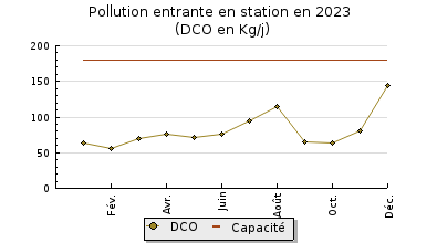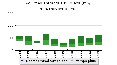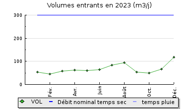 | Système de collecte : Le graphique corrélant les volumes journaliers entrants et les données pluviométriques montre que le réseau est impacté par lintrusion deaux claires parasites lors des précipitations (météoriques). On note une augmentation du volume en période estivale qui sexplique par la fréquentation touristique en cette période. La station reçoit en moyenne 67 m3/j soit 22 % de la capacité hydraulique nominale de la station (300 m3/j). Un dépassement de la capacité hydraulique a eu lieu lors de la période de précipitations exceptionnelles survenue en fin dannée. La valeur maximale relevée est de 355 m³/j (le 12 décembre 2023) soit 118 % de la capacité nominale hydraulique ( pluie de 8 mm et 18 mm la veille). |