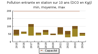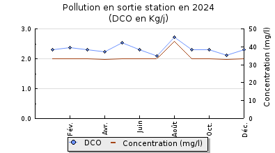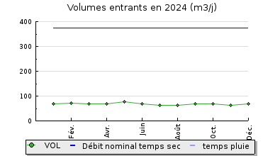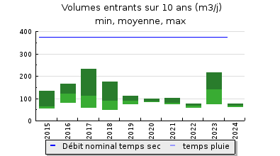 | Système de collecte : Le système de collecte est gravitaire. Ce dernier présente une certaine sensibilité vis-à-vis des apports deau claires parasites, bien que cela reste modéré, surtout en considérant la capacité hydraulique de la station. Une nette augmentation du volume collecté est constatée aux mois de mars, mai et octobre. Il est à noter que ces mois ont été particulièrement pluvieux. Une étude diagnostique a débuté en 2024. Ceci a pour but de dresser un bilan actuel de fonctionnement des systèmes dassainissement collectif, déliminer le maximum deaux parasites, de mettre en place les améliorations nécessaires au bon fonctionnement des systèmes dassainissement et détablir un programme des travaux à mettre en place. |