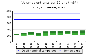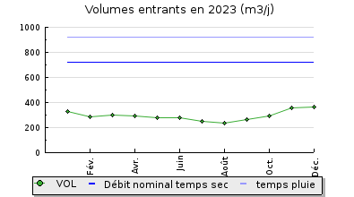 | Système de collecte : Le réseau de collecte est séparatif. Il est équipé de 5 postes de refoulement qui sont curés de 1 à 3 fois par an. Celui du bord du Tarn a été refait. Les sous-produits de curage sont traités à Ginestous. Le réseau est encombré d'eaux claires parasites par temps de pluie (présence d'un bassin d'orage de 200 m3 pour écrêter les débits et d'un DO en amont du poste principal). La station a traité jusqu'à 637 m3 (janvier 2023) par jour alors que le volume moyen traité est d'environ 295 m3. Le DO en amont du poste principal est équipé d'une sonde US (pas de by-pass en 2023). |