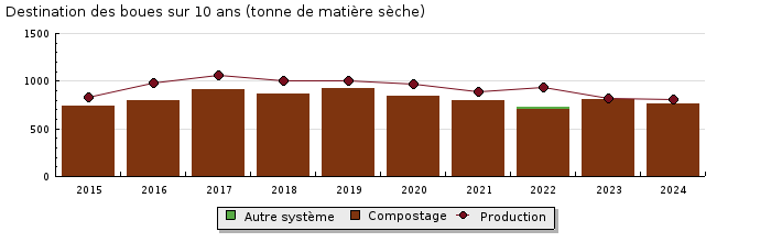 | Sous produits : Les refus de dégrillage et les sables, sont pris en charge par Suez R&V et incinérés. Les graisses sont traitées sur site par le procédé Biolix. Les boues sont épaissies puis centrifugées (30% de siccité en moyenne). Elles sont évacuées vers 7 différentes plateformes de compostage (gestion par Suez Organic). La production de boues pour 2024 est de 806 T de MS. |