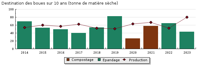 | Sous produits : Les refus de dégrillage sont compactés et évacués tous les 2 mois vers la SETMI (3.8 t). Les sables (76.8 t) et les graisses (34.6 t) sont stockés dans 2 ouvrages et évacués tous le 2 mois par RESEAU31 sur la STEP de Ginestous. Les boues sont épaissies à l'aide d'un tambour filtrant, stockées dans un silo à boues de 1560 m3, la production annuelle est de 79.7 tMS (calcul théorique de production : 77 tMS). Une partie de cette production a été valorisé en épandage agricole (43.2 tMS) ; le résiduel est stocké dans le silo (436 m3 soit 20.9 tMS). |
