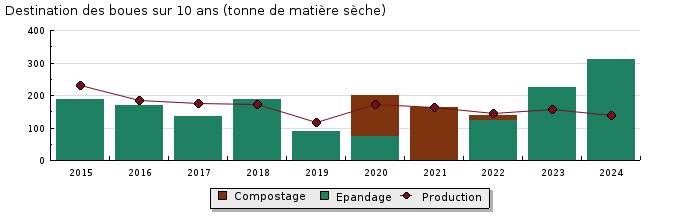 | Sous produits : Les boues sont épaissies, stockées dans des bennes puis transférées vers l'aire de stockage pour épandage agricole. Production de boues 2024 : 704 T de boues brutes à 19.8% de siccité soit 139.1 T de MS (donnée SMEA). Cette production de boue semble un peu élevée par rapport à la charge polluante reçue par la station. La station est équipée d'un silo de stockage de 450 m3 pour pouvoir stocker des boues liquides en cas de panne de la centrifugeuse. Les refus de dégrillage sont compactés, ensachés dans un container puis évacués par la SITA en incinération (0.79 T en 2024). Les graisses sont reprises dans un réacteur à graisses dont la surverse s'écoule dans le poste toutes eaux. Le poste toutes eaux renvoie les effluents en aval du dégrilleur. Les sables passent dans un classificateur et sont stockés dans une benne. Production de graisses 2024 = 85 T. Production de sable 2024= 19.3 T (données SMEA). |