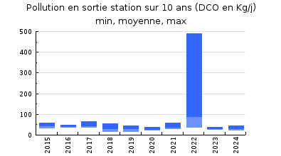 | Station d'épuration : Bon fonctionnement et bon entretien global du dispositif. Le taux de charge hydraulique moyen sur l'année par rapport au débit de référence est de 44%, la charge organique moyenne est d'environ 46%. Il n'y a plus d'apport de matières de vidange depuis le 12/06/2023 en raison de la panne du dégrilleur automatique (l'unité de dépotage a été mise à l'arrêt). Les équipements liés à la réalisation des bilans d'autosurveillance sont opérationnels et globalement bien entretenus (préleveurs et débitmètres). On note encore des écarts de volumes importants entre l'entrée et la sortie station en raison d'un important développement d'algues dans le canal de comptage de sortie qui provoque une augmentation de la hauteur d'eau et donc du débit mesuré. |