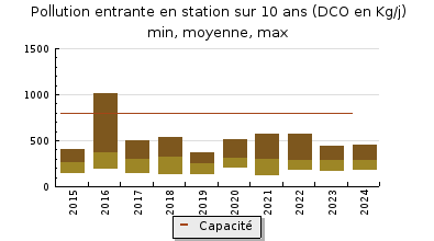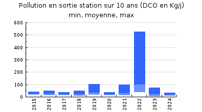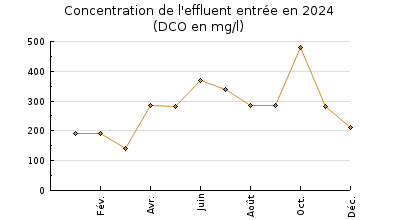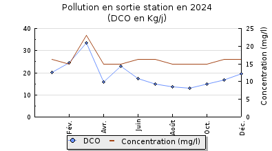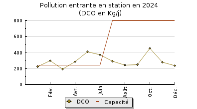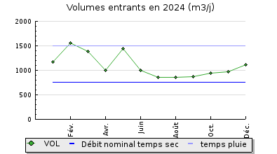 | Système de collecte : Le réseau de collecte est séparatif et gravitaire. Les interventions se font à la demande. Le réseau est très sensible aux infiltrations d'eaux claires parasites. Le volume maximum mesuré en entrée de station est de 3531 m3/j soit 235% du débit de référence. |
