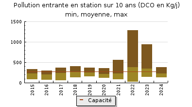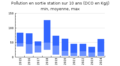 | Station d'épuration : La gestion (cahier de bord présent et à jour) et l'exploitation (via la supervision) du site sont satisfaisantes. Les passages sont 1 à 2 par semaine. Les ouvrages et les équipements sont entretenus : 4/an pour le poste de relevage des eaux brutes et 1/an pour le décanteur-digesteur. La surface du décanteur-digesteur est à nettoyer plus régulièrement. La rotation des sprinklers des 2 lits bactériens assure une bonne répartition des effluents. La station a traité un volume moyen journalier de 491 m3. Le volume bypassé annuel est de 9604 m3 soit 5% du volume entrant. Les charges polluantes à traiter sont de 61% pour la DBO5, 71% pour la DCO, 43% pour les MES et 56% pour le NK. Les rendements varient autour de 90% pour tous paramètres. L'apport massif d'eaux parasites par temps de pluies impacte le rejet (départ de MES et de boues). |