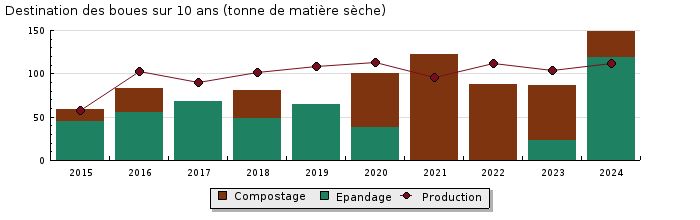 | Sous produits : Les refus de dégrillage sont stockés en container puis évacués à la SETMI par Véolia propreté (2/3 bacs tous les 15 jours). Une partie de la grille sous la vis est à changer (trouée). Les graisses sont traitées sur place et réinjectées dans la station. En complément, 7.5 tonnes ont été évacuées. La station reçoit beaucoup de graisses. Les sables sont pompés 1 fois/an par le SIVOM SAGe et transférés à Ginestous (6 t en 2024). Les boues sont traitées sur les deux tables d'égouttage puis sur la centrifugeuse ou envoyées vers le silo de stockage. 2160 m3, soit 60 t de MS, de boues liquides ont été épandues en 2024. Les boues centrifugées sont stockées en bennes et envoyées en compostage (14.7 T de MS) sur la plateforme de compostage du Casteron. La production de boues (74.7 TMS) est en accord avec la charge à traiter. La production de boues théorique est d'environ 78 TMS. |