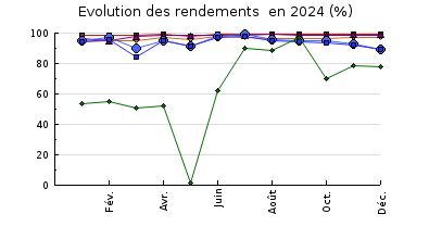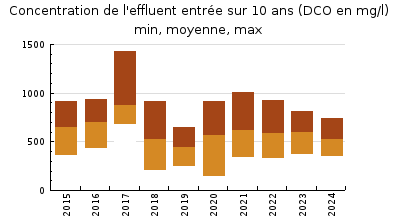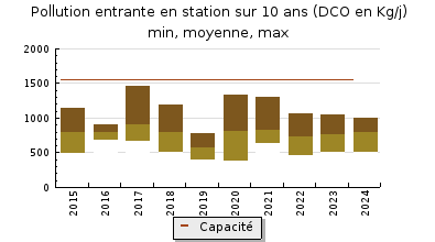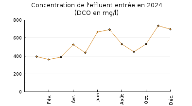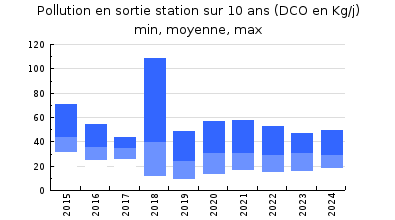 | Station d'épuration : La station est équipée d'une télésurveillance et d'un carnet de bord à jour. La gestion et l'exploitation du site sont satisfaisantes. Le taux de charge hydraulique est de 53% par rapport au débit de référence et de 56% par rapport au percentile 95. Le taux de charge organique est de l'ordre de 52%. Les opérations courantes : nettoyage, maintenance et suivi process sont exécutées régulièrement. Le débit arrivant à la station est limité et le surplus d'effluent est envoyé dans un bassin tampon. Les réglages de la station sont adaptés en fonction des résultats d'analyse en sortie et du taux de boues. L'aération est régulée par sonde rédox et la recirculation sur table horaire. Le phosphore est traité par addition de PAX (sel d'aluminium) et seulement en période d'étiage depuis 2021. L'entretien des rampes d'aération a été effectuée en 2022. Le charbon actif de toutes les désodorisations a été renouvelé en 2024. Des améliorations sur la sécurité sont envisagées (barreaudage, mise en place d'une passerelle..). Un problème de vanne a bloqué les extractions de boues durant 1 mois de l'été mais n'a eu aucun impact sur la qualité du traitement épuratoire. Il y a régulièrement des problèmes de surpresseurs. L'effluent traité est conforme à l'objectif de traitement en 2024. |