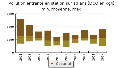 | Station d'épuration : Cette station est bien entretenue et bien suivie. Elle traite en moyenne 4551 m3 par jour soit une charge hydraulique de 51%. La station est chargée à environ 79% de sa capacité organique. Sur les deux files, l'aération est régulée par des sondes Redox et oxygène. Des analyses process sont réalisées toutes les semaines. Les réglages sont adaptés à la charge à traiter. La recirculation est réglée à 150% du débit entrant sur chaque file. Le traitement du phosphore est réalisé par l'injection de Chlorure Ferrique. En 2023, le bassin d'aération de la file A a été nettoyé et les membranes ont été remplacées. Les données d'autosurveillance sont fiables, mais le manuel fait toujours défaut. Les débuts des travaux pour l'extension de la station à 30 000 EQH ont démarré en 2023. L'extension de la station comprend une nouvelle file boues activées (la troisième). Les prétraitements seront modifiés : changement du dégrilleur et doublement du dégraisseur dessableur. La mise en eau de la nouvelle file de traitement était prévue fin décembre 2024. Malgré les difficultés d'exploitation liés aux travaux, le fonctionnement épuratoire de cette station est très satisfaisant. Les résultats sont conformes en 2024. |