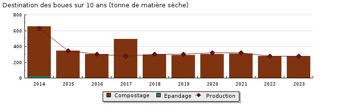 | Sous produits : Les refus de dégrillage sont évacués par la SITA jusqu'au centre d'incinération de Bessières (tous les 3 à 4 mois). Les graisses sont traitées sur la station par digestion. Les sables sont transférés par la SRA-SAVAC vers le centre de traitement d'Albi. Les boues de la station de Revel Dreuilhe (8 m3 tous les 4 mois) ainsi que les sous-produits du curage des postes sont réinjectés dans la filière. Les boues centrifugées sont évacuées vers la plateforme de compostage de Labécède Lauragais (2 à 4 bennes par semaine). La production de boues pour l'année 2023 est de 279.76TMS. La production de boues est en adéquation avec la charge polluante à traiter (255TMS). |