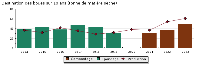 | Sous produits : Les refus de dégrillage sont pris en charge par Véolia Propreté et sont incinérés. Les graisses sont traitées sur place et réinjectées dans le bassin d'aération. Les sables sont stockés dans un ouvrage avant d'être envoyés par l'entreprise BOVO vers Ginestous. Les boues du clarificateur sont déshydratées via une presse à vis puis stockées dans deux bennes désodorisées. Le silo à boue de 430m3 ne sert plus. Cette année 49 T de MS ont été évacuées vers le centre de compostage de Montans (81) par l'entreprise BOVO. Cette production est en adéquation avec la charge organique à traiter. |