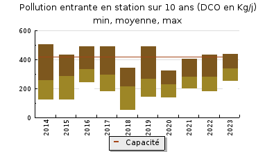 | Station d'épuration : Des analyses de contrôle sont réalisées au moins une fois par semaine (taux de Boues, NH4, NO3 et Pt). L'aération est réglée par sonde rédox et la recirculation est réglée sur horloge. La station traite le phosphore. Le manuel d'autosurveillance est à jour. La mise en uvre des autosurveillances et le fonctionnement des équipements liés sont corrects. Une supervision et une télésurveillance sont présentes à la station. Véolia mobilise en permanence le personnel nécessaire au bon entretien de la station. La station a une charge moyenne annuelle organique de 58% et une charge hydraulique de 67%. Le fonctionnement global de la station est très satisfaisant. |