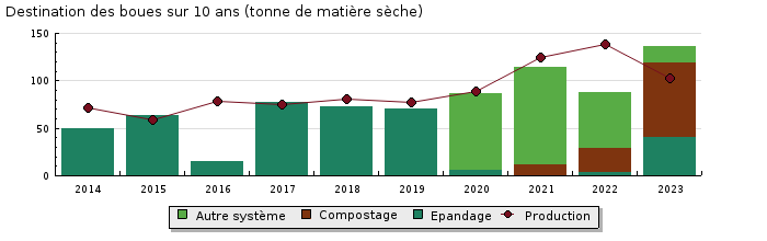 | Sous produits : En 2023, 102.89 T de MS ont été produites. Des boues ont été transférées sur les stations de Plaisance du Touch (3.17 T de MS), de l'Aussonnelle (3.17 T de MS) et de Ste Foy de Peyrolières (9.5 T de MS). 44.12 T de MS ont également été déshydratées sur place puis transférées sur des plateformes de compostage et enfin 42.14 T de MS ont été épandus. La production théorique de boues de cette station est d'environ 122 T de MS. Les refus de dégrillage sont incinérés (Véolia Propreté), les sables et les graisses sont traités à Ginestous. |