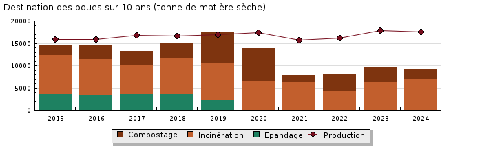| Sous produits : Les refus partent en incinération (SETMI, 683 tonnes). Les graisses sont incinérées à la station ou évacuées vers la SETMI (1187 tonnes). Les sables sont évacués pour incinération vers la SETMI (670 tonnes). En 2024, La quantité de boues évacuées est évaluée à 9133.6 tonnes de MS. La majorité des boues est incinérée sur site après méthanisation (77.5%). La partie restante part vers des plateformes de compostage (22.3%), (Durance, Casteron, Fertigaronne, Ginestous ) ou sur une unité de méthanisation extérieure (Montauban ou Carcassonne pour 0.2 %). |