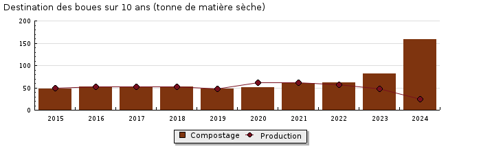 | Sous produits : Les boues déshydratées (17 à 21 % de siccité) par centrifugeuse sont envoyées vers la plateforme de compostage de Leboulin. Une optimisation du dosage du polymère a été réalisée pour limiter la consommation du polymère. La quantité de boues évacuée est de 165 tonnes depuis le début de lannée 2024 soit 33 tonnes de matière sèche pour une siccité moyenne de 20%. |