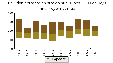 | Système de collecte : Le débit collecté est sensible aux conditions météo, en particulier à la pluviométrie (peu de ressuyage). La capacité est alors très ponctuellement dépassée. La station est en moyenne aux 2/3 de sa capacité. Des surcharges hydrauliques sont notées, rarement très élevées (il n¿y en a pas eu en 2022, année particulièrement sèche) et assez peu fréquentes (moins de 20 fois par an).  |